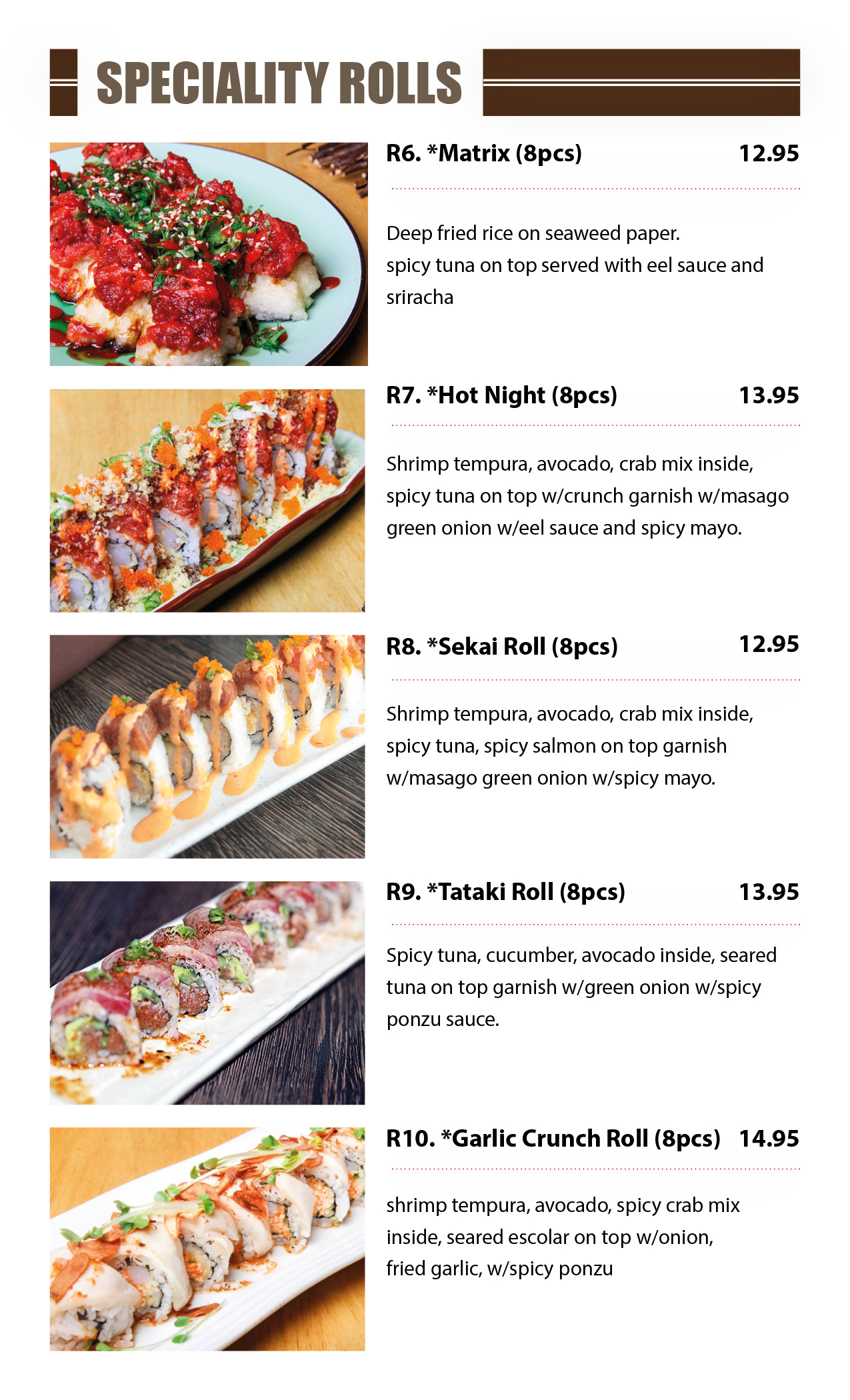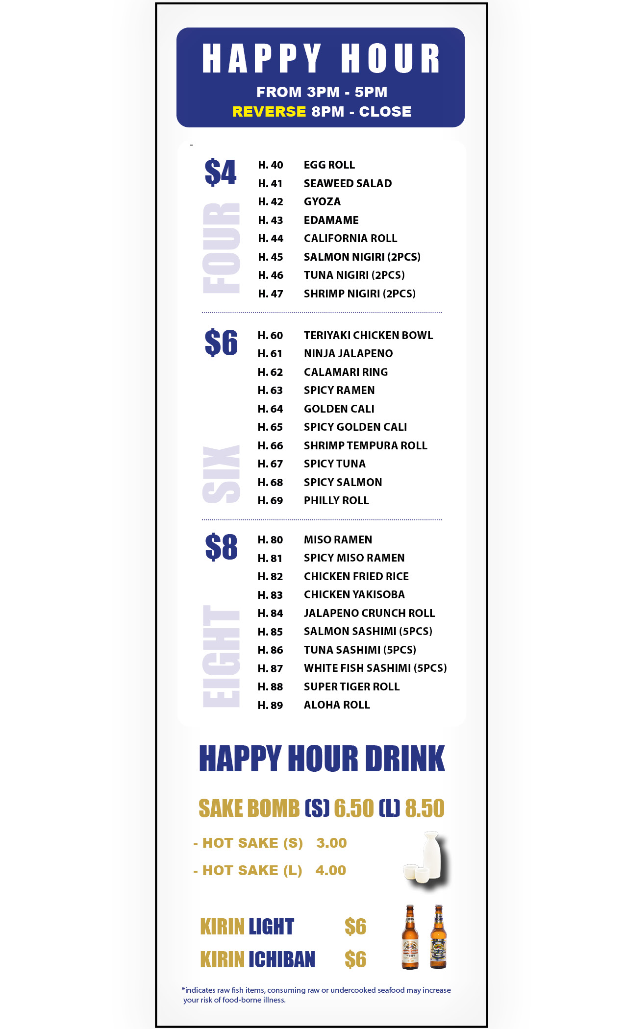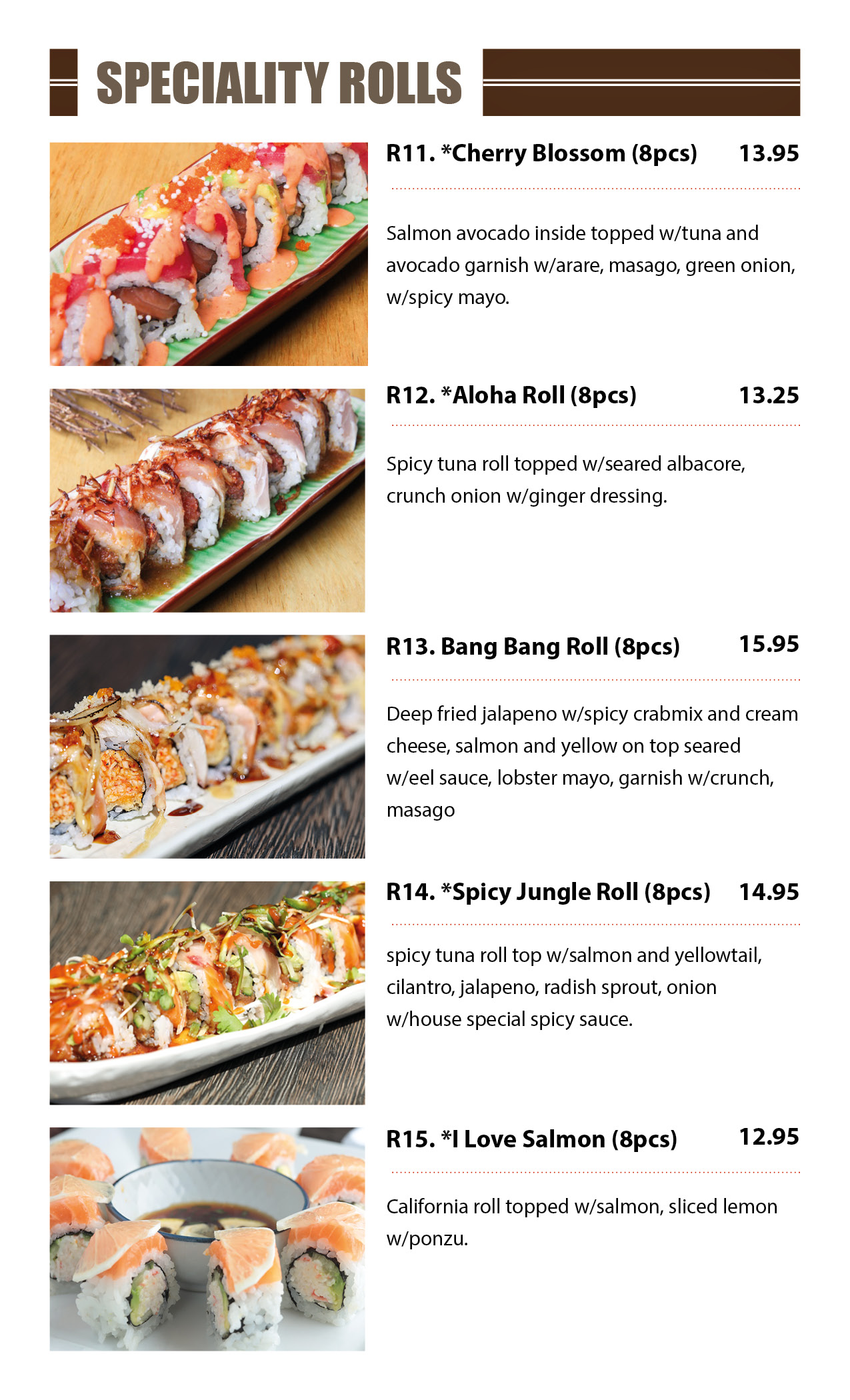 HAPPY HOUR APPETIZER ENTREE LUNCH SPECIAL BASIC ROLLS & SUSHI SPECIAL ROLLS #1 SPECIAL ROLLS #2 & ALCOHOL